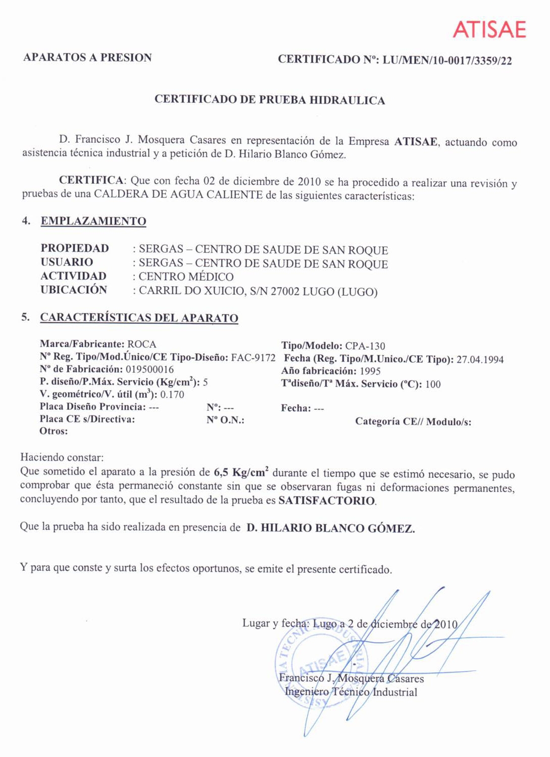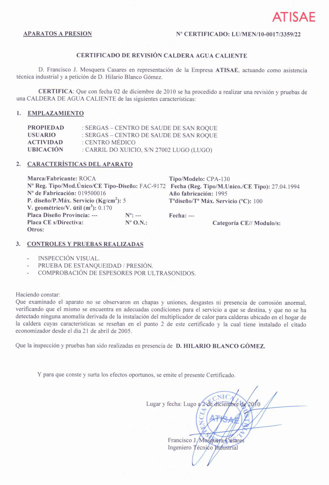 Este certificado ha sido realizado por el organismo de control autorizado (ATISAE), lo cual se ha probado que es inofensivo para las calderas, con los siguientes resultados de la inspección y pruebas: